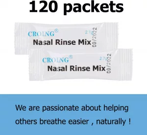 La sal incluida en el paquete Croing Irrigador Nasal es de alta calidad y proporciona una soluci贸n de enjuague nasal 贸ptima. Cada paquete de sal de 2.7 g se utiliza para producir una soluci贸n de enjuague nasal, lo que significa que el paquete de 40 es suficiente para una limpieza nasal regular durante un tiempo prolongado.