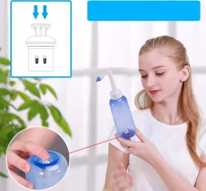 - Coloca la boquilla de lavado nasal en una de las fosas nasales y aprieta suavemente la botella para que el agua salga por la otra fosa nasal.