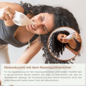 La Bodhi Neti Pot funciona según el principio de la gravedad. La solución salina se vierte en una fosa nasal y sale por la otra fosa nasal, eliminando cualquier impureza y limpiando las fosas nasales. El proceso es suave y natural, y ayuda a mantener las fosas nasales limpias e hidratadas.